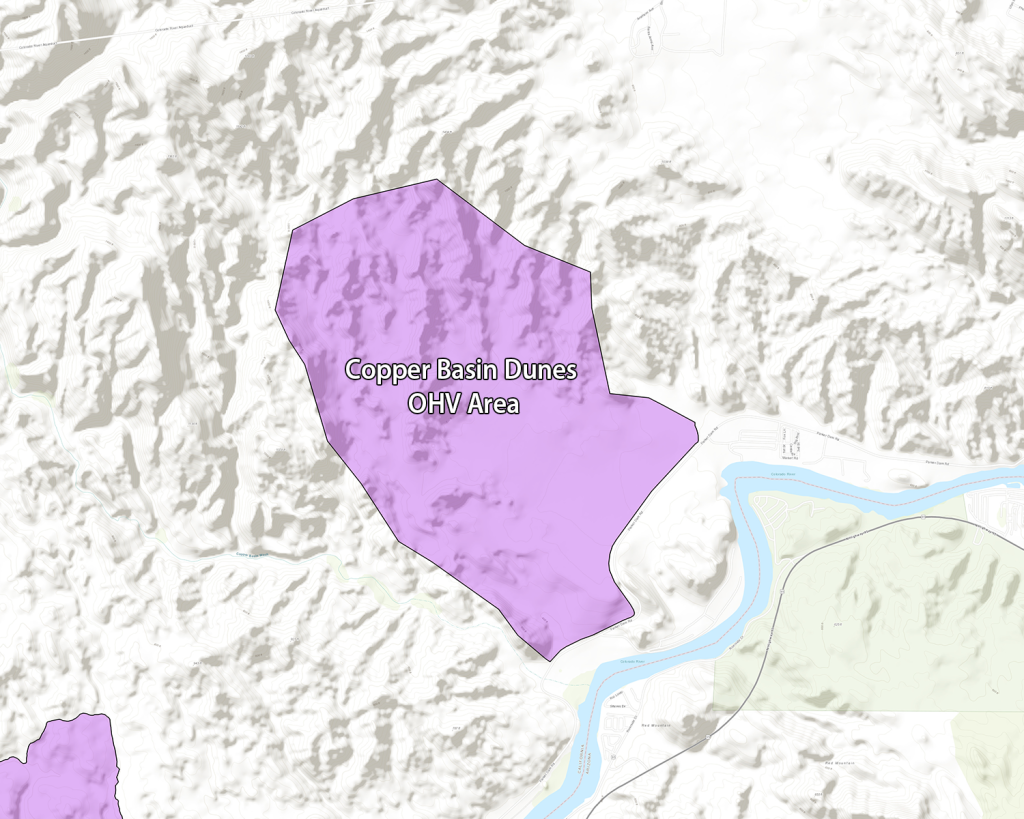 This area boasts 1200 acres of open area with a variety of desert trails, power-line roads, and some isolated sand dunes. The dunes offer some nice views of the river but you cannot ride all the way to the water.